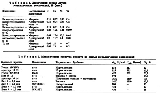 Технология производства литых многослойных композиций основана на создании в центральной части слитка при его отливке внутреннего слоя, отличного по химическому составу и структуре от поверхностного, за счет формирования его из жидких фаз частично закристаллизовавшегося поверхностного слоя и доливаемого к нему сплава другого состава. Из литых металлических композиций изготовлен листовой прокат, лента, арматурные профили, резьбовые крепежные изделия, угловой прокат, специальные профили шахтной крепи и исследованы свойства указанных видов металлопродукции. Химический состав и механические свойства композиций приведены в табл. 1 и 2. Прочностные характеристики изделий несколько превышают прочность стали матрицы при удовлетворительной пластичности (табл. 2). Показатели ударной вязкости Аю работа зарождения Аъ и развития трещины Ар композитной арматуры в 1,3—4 раза больше, чем в Многослойная сталь ферритного класса на базе стали 08Х18Т1 имеет большую агрегатную пластичность за счет уменьшения содержания карбидов и увеличения содержания железа во внутреннем слое. Прокат из многослойных металлических композиций опробован в строительстве, авто-мобильной, пищевой и химической промышлен-ности. Применение указанных материалов по-зволяет экономить до 20 % легирующих элементов и снизить стоимость одной тонны стали на 13-35%.
