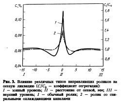 Дальнейшее снижение содержания серы обеспечивается обработкой элементами (например, кальцием), которые имеют высокое сродство к сере и способствуют понижению деформируемости сульфидов при прокатке. Для успешного применения этого метода необходимо такое низкое содержание кислорода в ста _ ли, что не могло образоваться большого количества оксидных форм, поскольку оксидные включения могут также служить центрами инициируемого водородом растрескивания (ШС). Для снижения содержания кислорода и соответственно количества оксидов при производстве трубных сталей уже в течение ряда 96 лет применяют такие методы, как бесшлаковый слив жидкой стали из конвертера, защиту струи при непрерывной разливке для избежания контакта расплавленной стали с воздухом. Осевая ликвация определяется в основном условиями разливки и кристаллизации. В процессе затвердевания непрерывнолитых слябов ликвация легирующих и примесных элементов определяется максимальной концентрацией этих элементов на фронте кристаллизации. Во время разливки затвердевшая оболочка сляба поддерживается направляющими роликами, которые могут изгибаться и придавать ей соответствующую выпуклую форму. Обогащенный жидкий металл от фронта кристаллизации может затем перетекать в эту выпуклость и захватываться там. Чтобы этого избежать Маннесман разработал специальный тип роликов, 0 которые представляют собой массивные цилиндры с винтовыми каналами для подачи охлаждающей воды прямо под внешней поверхностью. Интенсивное охлаждение позволяет держать сердцевину ролика все время холодной, что препятствует искривлению его поверхности. Максимальный изгиб этих тянущих роликов существенно уменьшен по сравнению с обычными. Благодаря увеличенной жесткости этих роликов возможно также использование клиновидной направляющей ручья в зоне окончательной кристаллизации. Это помогает предотвратить образование широкой зоны ликвации и даже рыхлости в осевой зоне сляба. Использование только этого типа роликов клиновидного зазора позволило уменьшить осевую ликвацию в слябах. На рис. 3 показано влияние различшх конструкций роликов на осевую ликвацию. На сопротивление сталей водородному растрескиванию (ШС) может благоприятно влиять ускоренное охлаждение металла на толстолистовых станах. В результате получается равномерная мелкозернистая микроструктура, а также улучшаются прочностные и пластические свойства по сравнению со сталями, изготовленными при обычной схеме прокатки. Система охлаждения, применяемая для производства ускоренно охлажденной стали по Маннесману (the Mannesmann Accelerated Cooled Steel, MACOS) адаптирована в применении к толстолистовому стану.