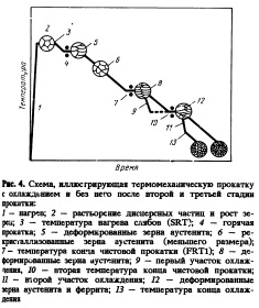 Физикометаллургические процессы, протекающие при термомеханической прокатке в комбинации с ускоренным охлаждением, показаны на рис. 4, где приведены наиболее важные контролируемые стадии и параметры прокатки. Они включают яовторный нагрев сляба,чтобы перевести в твердый раствор карбонит риды микролегирующих элементов; черновую прокатку для получения мелкого рекристалли зованного зерна полигонального аустенита; температуру прокатки в чистовой клети 1 (FRT1), которая должна соответствовать области рекристаллизованного аустенита; степень окончательной деформации (FD) в этом интервале температур; температуру конца чистовой прокатки в клети 2 (FRT2) в аусте нитноферритной двухфазной области. Прокатка в этой области улучшает прочность листов. Охлаждающая система может быть задействована в цикле прокатки дважды, а именно: операция охлаждения 1 следует за первой стадией чистовой прокатки и предотвращает развитие рекристаллизации или возврата в верхней части ферритной области; операция охлаждения 2 следует за второй стадией чистовой прокатки и улучшает равномерность микроструктуры.