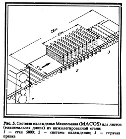 Операция охлаждения 1 направлена на измельчение зерен феррита, тогда как операция 2 тормозит образование перлита во время охлаждения, и следовательно, увеличивает гомогенность окончательной микроструктуры. Важнейшие параметры операций охлаждения: скорость охлаждения и температура прерывания ускоренного охлаждения (CST). По сравнению с другими охлаждающими системами система Маннесмана позволяет осуществлять охлаждение после второй и третьей стадий прокатки, поскольку, вопервых, она компактна и, вовторых, установлена в 5м клети перед горячей правильной машиной (рис. 5). Охлаждающая система спроектирована так, что позволяет охлаждать листы шириной до 5 м, длиной до 20 м и толщиной до 40 мм, которые требуются для производства труб большого диаметра [з]. Сравнительная оценка эффективности систем охлаждения разбрызгиванием струй, ламинарным течением из трубок и ламинарно текущими завесами свидетельствует о преимуществе последних изза их равномерного охлаждающего эффекта. Эти охлаждаюшие завесы установлены так, что лист можно охлаждать и сверху, и снизу.