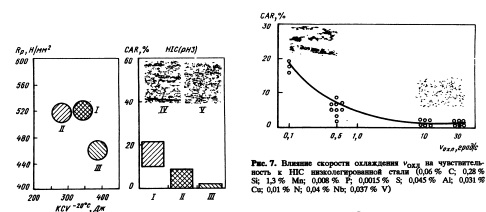 Все операции прокатки и охлаждения проводятся под комьютерным наблюдением и контролем. Параметры охлаждения, которые варьируются в зависимости от толщины и температуры после второй и третьей стадий прокатки, также определяются специальной управляющей программой компьютера. Она позволяет варьировать скорость потока охлаждающей воды и скорость выводного рольганга. Равномерность охлаждения подтверждается замерами распределения температуры на поверхности листа. Равномерность микроструктуры и механических свойств в готовом листе также свидетельствует о высокой эффективности охлаждения [4]. На рис. 6 показано влияние ускоренного охлаждения на механические свойства и сопротивление ШС стали, которая чувствительна к ШС после обычной схемы прокатки. Оценка растрескивания в образцах, подвергнутых ШС в стандартном растворе, была проведена с помощью УЗК. Величина относительной площади растрескивания CAR представляет собой отношение площади, занимаемой трещинами, к площади образца в плоскости листа.