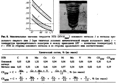 Сварка Большинство спецификаций заказчиков на трубы для кислых сред требуют ограничения максимальной твердости не выше 248 HV 10. Это требование распространяется не только на трубы, но также на ЗТВ (зону термического влияния) круговой сварки. Максимальных значений твердости можно ожидать вблизи сварного шва. Поэтому следует уделять специальное внимание химическому составу металла продольных швов в связи с аспектами полевой сварки, где контролируется твердость ЗТВ Тобразного соединения. Как видно из данных рис. 8, продольные швы свариваемого металла при дуговой сварке Мп—Ni—Моэлектродами характеризуются относительно высоким содержанием углерода и более высокой твердостью в Тобразных областях ЗТВ по сравнению с основным металлом (состава, типичного для сталей, назначаемых для кислых окружающих сред). Это объясняется относительно высоким содержанием в них никеля и молибдена при сходстве остального состава. Только с применением относительно высоких температур предварительного подогрева и между проходами сварки появилась возможность уменьшить твердость до значений ниже 248 HV 10. До производства труб по заказам были проведены серии испытаний для оптимизации состава металла сварного шва таким образом, чтобы его твердость была сравнима с твердостью листа при требуемой вязкости. Это было достигнуто использованием специально разработанной низкоуглеродистой легированной титанобористой сварочной проволоки, остальной состав которой очень близок к основному металлу. Дополнительным требованием для получения необходимой вязкости явилось ограничение содержания азота в металле шва. Для нескольких крупных заказов требуемая вязкость центра металла шва и ЗТВ при температуре — 30 °С были: не менее 37 Дж у отдельных образцов и не менее 45 Дж для среднего значения по трем образцам. Несмотря на эти ужесточенные условия испытаний, все заказы могли быть выполнены с полным соблюдением спецификации. По требованию заказчиков использовали не содержащие молибден титанобористые, а также MnNiMo (без TiB) сварные электроды.
