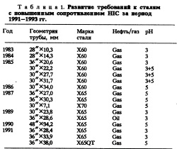 Результаты производства Создание сталёй для трубопроводов, эксплуатирующихся в условиях кислых сред, за последние 10 лет определялось требованиями рынка. Состояние производства трубопроводов иллюстрируют данные табл. 1 о выполнении некоторых заказов на проекты трубопроводов для кислых сред. Они отражают изменение требований рынка к толщине стенки трубы, классу (прочности) материала и сопротивлению воздействию кислой окружающей среды (в зависимости от pH раствора, используемого для испытаний на ШС).