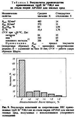 Химический состав стали для стенок указанных толщин приведен в табл. 2. Количество труб с более толстой стенкой составило 7000 т. Они использовались в качестве стояков трубопровода. Малые значения стандартных отклонений содержания элементов показывают, что плавки имели исключительно однородный химический состав. В табл. 3 обобщены статистические данные о механических свойствах. Все требования спецификаций были полностью выполнены, разброс данных был очень небольшой. Статистическое представление сопротивления ШС