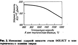 "Запорожсталь" производит также прокат из ферритных коррозионностойких экономнолегированных сталей. Наиболее известная сталь марки 08Х18Т1, созданная комбинатом "Запорожсталь" совместно с Московским авиационнотехнологическим институтом и заводом "Днепроспецсталь", стала массовым недорогим заменителем хромоникелевых сталей. Однако сталь склонна к отпускной хрупкости при температуре 475 °С. При температуре выше 1000 °С рост зерна феррита становится интенсивным, что требует специальных способов ее сварки, предупреждающих охрупчивание сварных соединений. Поиск новых экономнолегированных корро зионностойких сталей ферритного класса с улучшенными, чем у стали 08X1811, потребительскими свойствами, проводится с использованием для выплавки возможности агрегата газокислородного рафинирования (ГКР) завода "Днепроспецсталь". Совместно с ЦНИИчерметом и заводом "Днепроспецсталь" освоена технология выплавки и производства полосовой в рулонах (ТУ* 1415015—91) и листовой (ТУ 1415014—91) холоднокатаной стали марки 04Х15СТ—Гр. толщиной 0,8—2,0 мм. Эта сталь предназначена для изготовления бытовой техники, оборудования машиностроения и товаров Рве. 2. Изменение ударной вязкости стали 04Х15СТ в зоне термическо.хэ влияния сварки широкого потребления, обладает высокой технологичностью в горячем и холодном состояниях, не склонна к охрупчиванию (рис. 2), имеет удовлетворительное качество поверхности холоднокатаных листов.