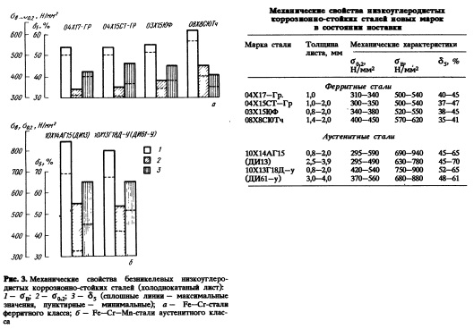 Совместно с Ростовским госуниверситетом и заводом "Днепроспецсталь" разработан состав й освоена технология производства крупных слитков (до 14,7 т) и холоднокатаного листа толщиной 1,0—2,0 мм из 'новой стали марки 04X17—Гр, который выпускается в рулонах (ТУ 141495581) и в листах (ТУ 141 4954—91). Сталь отличается повышенной (по сравнению со сталью 08X1811) стойкостью в агрессивных средах, лучшей пластичностью и вязкостью. Диеты хорошо штампуются и свариваются. Листовая сталь 04X17—Гр. толщиной 1,0 мм апробирована при производстве кухонных моек. Рулонный полосовой прокат толщиной 1,5 и 2,0 мм используется для производства сварных труб диаметром 42 и 43 мм на Новомосковском трубном заводе вместо стали марки 12Х18Н10Т. Совместно с ЦНИИТмашем и заводом "Днепроспецсталь" разработана и освоена технология производства холоднокатаного листа толщиной 0,8—2,0 мм из новой коррозионно стойкой стали 03Х15ЮФ (ТУ 1422612891). Сталь обладает коррозионной стойкостью в водных, щелочных, слабокислотных и нейтральных средах (мазут, бензин); не склонна к коррозионному растрескиванию под напряжением. Она может работать в диапазоне температур от —20 до +350 °С. Окалиностойкость стали гарантируется до 800 °С. Листы из нее могут свариваться всеми видами сварки. Сталь хорошо полируется электролитическим способом и в меньшей степени, чем сталь 08Х18Н10Т, склонна к наклепу при штамповке. Листовая сталь 03Х15ЮФ опробована при изготовлении кухонных двухванных сварных моек, емкостей для охлаждения молока, оборудования нагревательных электропечей, пластинчатых теплообменников. Применение экономнолегированных корро зионностойких сталей разрешено органами здравоохранения для изготовления широкой Для изготовления глушителей выхлопной системы атомобилей комбинатом совместно с Запорожским машиностроительным институтом и заводом "Днепроспецсталь” освоена технология производства жаропрочной экономно легированной стали марки 08Х8СЮТч. Сталь опробована при изготовлении глушителей выхлопной системы автомобилей ВАЗ и ЗАЗ и показала удовлетворительные технологические й эксплуатационные свойства. На рис. 3 и в таблице представлены механические свойства листов коррозионно стойких сталей новых марок, освоенных комбинатом.