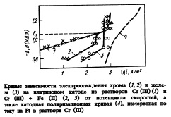 Понятно, что выбор оптимальных (в отношении получения покрытий с максимальными скоростями и ВТ) условий электролиза требует, в первую очередь, определения зависимости скоростей электроосаждения хрома от концентрации соли Cr(lll) и pH раствора (т.е. выяснения значений порядка реакции разряда ионов Сг3+ по собственным ионам и по ионам Н+). Было показано, что в исследованной области значений соли Cr(lll) (ССг) (0,05М 0,48М) и pH (0,43,5) скорость реакции электроосаждения хрома (/<>) не зависит от pH электролита и закономерно возрастает с увеличением содержания сульфата хрома (dl\giCr/ d\gCCr = 1; <Я&сг/ = °) Следует отметить, что при увеличении pH электролита до значения 3,8 [близкого к значению pH гидратообразования Сг(111)] скорость электроосаждения хрома заметно снижается. Однако снижение скорости в этом случае вероятнее всего связано не с изменением кинетических характеристик, а со вторичными эффектами, скорее всего — с заполнением поверхности электрода основными соединениями хрома и изолированием ими части поверхности. Это подтверждается как внешним видом электрода (на его поверхности пошляется матовый, серозеленый, легко снимающийся механически налет), так и характером изменения скорости электроосаждения во времени. Измеренные по току суммарные поляризационные кривые, полученные для различных pH электролита и концентраций сульфата хрома /111), показали, что скорость суммарного процесса (разряда Сг+ и выделения ч Н2) мало зависит от pH и ССг: при возрастании концентраций ионов Н+ и Сг* она незначительно увеличивается. Учитывая приведенные выше результаты, можно ожидать, что получение хромовых покрытий с максимальными скоростью и выходом по току возможно при значениях pH электролита, равных 23, концентрации Cr2(S04)3, равной 0,48 М (дальнейшее увеличение концентрации соли Cr(lll) затруднительно по соображениям ее растворимого) и потенциала электоосаждения (1,05)—(1,5) В (н.в.э.). В гальваностатических условиях этой области потенциалов соответствуют (при указанных выше значениях pH и концентрации соли Cr(lll)) плотности катодного тока (DK)f равные (36) • 103А/м2. Экспериментальная проверка такого предположения подтвердила его справедливость и позволила сделать вывод о том, что указанные условия являются оптимальными для осуществления хромирования из раствора Cr(lll). В этих условиях можно осуществить получение хромового покрытия с выходом по току более 20%. Причем для получения покрытия толщиной, необходимой для ХЛЖ, время электролиза составляет 12,5 с (вместо 25 с, необходимых для получения хромового слоя достаточной толщины по применимой в настоящее время технологии). В указанных условиях хромовые покрытия имеют наименьшую пористость и обладают наилучшим качеством (по визуальной оценке). При переходе от растворов, содержащих только сульфат хрома (111) (на фоне выбранных в работе добавок), к смешанным растворам, содержащим наряду с Cr2(S04)3 также FeS04, характер зависимости скорости осаждения хрома от потенциала заметно меняется. Это иллюстрируется данными, приведенными на рисунке. Здесь кроме кривых осаждения хрома из чистого (кривая 1) и смешанного (кривая 2) электролитов (концентрация Cr2(S04)3 составляет 0,48М) приведена парциальная кривая соосаждающегося с хромом железа (кривая 3) для концентрации FeS04, равной 0, 1 М). Как видно, при относительно отрицательных потенциалах скорости осаждения хром