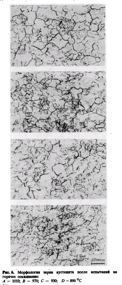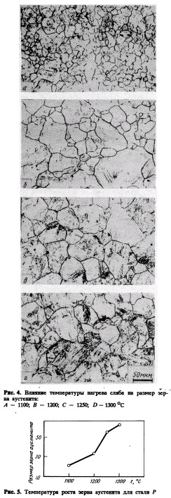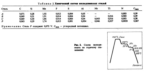 Эксперимгмтальные методики Исследованные стали Для проведения базового исследования в вакуумной индукционной печи были выплавлены три различные стали, обозначенные А, В и С (табл.2). Для изучения влияния микролеги рующих добавок на микроструктуру, механические свойства и механизм упрочнения в сталях изменяли содержание Nb и Ti. После анализа результатов, полученных на сталях А, В и С, был изготовлен непрерывнолитой сляб из стали Р; его состав приведен в табл.2. Для получения высоких уровней вязкости и свариваемости, содержание углерода и углеродный эквивалент были снижены до 0,07% и до 0,37 соответственно. Для снижения содержания серы, фосфора и газов было проведено интенсивное рафинирование стали. Базовое исследование Для определения оптимальных температур нагрева исследовали закономерности роста зерна аустенита в процессе нагрева стали Р. Образцы нагревали в диапазоне от 1100 до 1300 °С, как показано на рис.1. После выдержки б течение 30 мин при температуре нагрева образцы закаливали до комнатной температуры и исследовали зерно аустенита. С помощью этого эксперимента была определена оптимальная температура нагрева сляба. Для определения температуры рекристаллизации были выполнены испытания на горячее осаживание по режиму, показанному на рис.2. ![]()