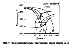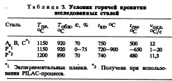С учетом базовой информации была проведена экспериментальная прокатка, с помощью которой определили требуемый диапазон температур конца прокатки (FRT) и накопленное суммарное обжатие (ARR). Фазовые превращения исследовали дилатометрическим способом на Greeble1500 и строили полную термокинетическую диаграмму (ССТ) путем исследования микроструктуры. Эксперименгальная прокатка Слитки из стали А, 3 и С прокатывали на лабораторном стане, оснащенном системой ускоренного охлаждения. Слябы из стали Р толщиной 220 мм нагревали до 1250 °С и прокатывали до толщины 100 мм. Эти раскаты толщиной 100 мм были разрезаны на несколько частей и прокатаны методом контролируемой прокатки до толщины 20 мм. Для получения полных результатов режимы контролируемой прокатки и ускоренного охлаждения варьировали в процессе эксперимента. После оптимизации режимов на лабораторном стане был осуществлен промышленный эксперимент с использованием системы PILAC. Сляб нагревали до 1200 °С для растворения легирующих элементов и минимизации аномального роста зерна аустенита. Для получения мелкого зерна феррита после превращения были использованы большие обжатия в области отсутствия рекристаллизации. Сразу после завершения горячей прокатки применяли ускоренное охлаждение со скоростью 11°С/с, которое прекращалось при температуре 480 °С. Режимы горячей прокатки приведены в табл.З. На рис.7 представлены термокинетические диаграммы. Когда скорость охлаждения составляет 1°С/с, температура превращения выше 600 °С и происходит образование перлита