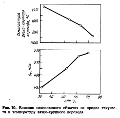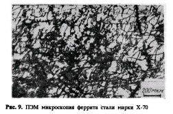 Среди основных режимов контролируемой прокатки (таких, как RT, ARR, температура конца прокатки FRT, температура конца охлаждения FCT и скорость охлаждения CR) показано влияние ARR на механические свойства на рис.10. При увеличении ARR в области с отсутствием рекристаллизации предел текучести увеличивается, а температура вязкохрупкого перехода при испытании образцов Шарпи В частности, трубная сталь марки Х70, изготовленная методом контролируемой прокатки, характеризуется высокой вязкостью, т.е. ударная вязкость при температуре —40 °С составляет 42 кгм и температура вязкохрупкого перехода около —80 °С. Такой высокий уровень вязкости объясняется низким углеродным эквивалентом у этой стали и тонкой микроструктурой, получаемой при точном контроле режимов прокатки и ускоренного охлаждения. Микроструктура трубной стали Х70 состоит из 70 % мелкозернистого феррита и 25% мелкодисперсного бейнита.