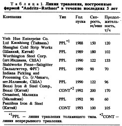 СОВРЕМЕННАЯ ТЕХНОЛОГИЯ ТРАВЛЕНИЯ И РЕГЕНЕРАЦИИРассмотрено создание и применение высокопроизводительных травильных линий толкающего типа. Проанализированы их преимущества по сравнению с малыми и средними линиями непрерывного травления. Описаны система регенерации кислоты и установка для восстановления смеси кислот после обработки полосы из нержавеющей стали1. Высокопроизводительные травильные линии толкающего типа Линии толкающего типа являются экономичной альтернативой малым и средним линиям непрерывного травления. Они появились в конце 50х годов и первоначально предназначались для травления небольших рулонов узкой горячекатаной полосы под последующее производство из нее спиральносварных труб. Затем сфера применения этих линий расширилась — на них начали обрабатывать горячекатаную полосу всех размеров, и таким образом линии толкающего типа стали незаменимыми для удовлетворения требований центров технического обслуживания, складов горячей стальной продукции и минизаводов. 4 Тот факт, что в травильных линиях толкающего типа не требуется наличие петледер жателей и сварочных установок, позволяет обрабатывать небольшие рулоны с максимальной скоростью, поскольку ограничения возникали в основном за счет затрат времени на сварку и зависели от производительности петледержателя. Почти полностью прямая конструкция линии позволяет обрабатывать особо твердые или хрупкие материалы. Кроме того, поскольку отсутствует необходююсть сваривать концы рулонов, на линиях такого типа можно обрабатывать плохо свариваемые или несвариваемые материалы. Возможность выполнять небольшие заказы, в том числе обрабатывать полосу с большой разницей в размерах, не соблюдать последовательность подачи рулонов и не подвергать их сортировке в зависимости от условий сварки— все это делает линии толкающего типа более предпочтительными по сравнению с линиями непрерыв нрго травления. Расширение применения этой новой технологии в центрах: технического обслуживания и на минизаводах влечет за собой создание новых, более производительных и сложных агрегатов. Пик развития пришелся на середину 70х и выразился в выработке двух типовых конструкций: по первому, достаточно недорогому варианту, линия включает в себя гранитные резервуары относительно простой конструкции, гидравлические приводы и механизмы натяжения; другая более сложная линия включает резервуары с высокоскоростным механизмом заправки полосы, электроприводы постоянного тока и современную систему подачи. На тот период обе системы соответствовали требованиям, при этом только вторая модель предполагала дальнейшее развитие и совершенствование. Производительность ЛИНЮ! толкающего типа составляла 100—300 тыс. в год при двухсменной работе предприятия. Как правило, обработке подвергалась полоса размером 0,060—0,375 дюймов (^1,5—8,5 мм). Казалось, что дальнейшего развития и распространения эта технология не получит. •Однако разработкой решила заняться фирма "Maschinenfabrik Andritz AG", объединив для этого два направления своей деятельности. "Andritz" является поставщиком турбин, специальных насосов и высокотехнологичных гидравлических систем, имеет свой НИИ по гидравлике в г.Граз (Австрия). Другой сферой деятельности фирмы "Andritz" является разработка технологии для металлургической отрасли по