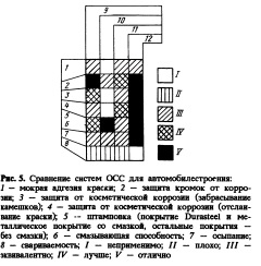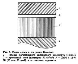 Следует снова отметить, что слой фосфатов улучшает формуемость за счет снижения коэффициента трения, но нивдк не влияет на образование порошка. Одним из недостатков "гальванила" является чувствительность к образованию кратеров при катафорезном окрашивании. На это могут влиять только технологические режимы процесса катафореза, такие как снижение напряжения, изменение геометрических условий в ванне или изменение химического состава собственно окрашивающей системы. 4. ОССкомпозитные системы покрытия с органическим веществом Основной целью разработки ОСС композитных систем является значительное усиление барьера коррозии в системах с металлическим покрытием. Таким образом, системы ОСС могут помочь в удовлетворении растущих требований автомобилестроения в плане защиты от коррозии: внутренних соединений, куда плохо проникает предварительно нанесенный электроосажденный грунт; в технологических пустотах или зазорах, которые невозможно или очень дорого полностью защи 4 тить от воздействия коррозионноактивной среды; в различного рода герметизированных уплотнениях. Системы ОСС можно подразделить на тонкие (свариваемые) покрытия, такие как в случае Durasteel, и смазывающие грунтовки (время от времени смываемые и постоянные), а также на толстые (несвариваемые) покрытия, такие как предварительные предгрунтовки. Эти последние предлагаются взамен катафорезных эпоксидов (EDpaint). На рис. 5 показаны области применения таких ОССсистем в автомобилестроении. По различной штриховке можно видеть, что значительное улучшение всех свойств наблюдается для предварительно грунтованных систем. Даже обычный вязкий грунт имеет определенные перспективы в автомобильной промышленности. Грунт с меняющейся вязкостью, называемый также сухой смазкой, разработан для замены антикоррозионной смазки и других мокрых смазок для улучшения штампуемости стали. Durasteel, основанная на цинкникелевом покрытии и разработанная в Японии [8—10], первоначально предназначалась для увеличения антикоррозийного барьера фланцев и пространства технологических отверстий корпуса автомобиля.