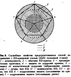В стадии разработки находятся очень многообещающие ОССсистемы, предназначенные для замены EDкраски. Структура предварительно грунтованного материала практически та же, что в классическом покрытии, полученном на проходной линии coil coating. Оно состоит из грунта (примерно 10 мкм) и поверхностного слоя (примерно 15 мкм). Грунт может содержать или не содержать хром. В качестве примера на рис. 8 показаны свойства такой системы (без хрома) в сравнении с обычной EDкраской. Система с пред грунтовкой в смысле свойств эквивалентна или. лучше EDкраски. Даже "сгон" по кромке сравним с таковым в случае EDокрашенной системы. Такое поведение на кромке явным образом зависит от типа металлического покрытия и его толщины, а также от качества окраски. В данном случае использовалась обычная EDкраска европейского происхождения. Кроме заметного улучшения штампуемости, показана отличная коррозионная барьерная защита.