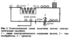 ТЕХНОЛОГИЯ ПРОИЗВОДСТВА тонких полос ИЗ ЧИСТОГО ЖЕЛЕЗА ЭЛЕКТРОЛИТИЧЕСКИМ СПОСОБОМВ работе представлена новая, не имеющая аналогов в мире, технология, позволяющая, минуя традиционные металлургические переделы (доменный, сталеплавильный, горячую прокатку и т.д.), получать тонкие полосы из чистого железа. Установлен оптимальный состав электролита и режимы электролиза. Исследована микроструктура осадков железа после электролиза, термообработки и прокатки. Приведены данные по физико-механическим и магнитным свойствам тонких полос, полученных по новой технологии.Производство тонколистового проката, необ-ходимого для электронной и электротехнической промышленности, является сложным, трудоемким и дорогостоящим. Получение тонких полос из чистого железа высокой степени чистоты по вредным примесям требует применения специальных обработок металла, полученного металлургическим способом, например, вакуумный переплав, длительный отжиг и т.д. Разработанная технология электролитического получения железной полосы позволяет значительно упростить этот процесс и исключить такие традиционные металлургические переделы, как доменный, сталеплавильный, горячую прокатку, вакуумный переплав и т.д. Данным способом возможно производство тонкой полосы из чистого железа с высокими физико-механическими и магнитными свойствами. За рубежом (в Германии, Англии, Японии, США) имеются разработки получения тонкой железной полосы электролитическим способом толщиной 0,03—0,15 мм. По существующей технологии железный осадок наносят на непрерывно движущийся барабан из титана, который обеспечивает минимальную адгезию железа к барабану (катоду). Затем железный осадок сдирается с барабана специальным ножом. В последнее время для интенсификации процесса железнения пытаются применить ячейки верти-кального типа с катодом из титана или тита- нированные. При этом сущность способа не изменяется. Полоса, полученная по существующей тех-нологии, имеет низкие механические свойства и уже во время отрыва, вследствие своей хрупкости, ломается. По этой причине данная технология не получила промышленного распространения. Способ получения железной полосы, пред-ложенный в Институте новой металлургической технологии (г.Москва), основан на двухстороннем покрытии железом непрерывно движущейся полосы с последующими переделами — термообработкой и холодной прокаткой до первоначальной толщины подложки. В результате прохода полосы через все переделы (рис. 1) получается полоса той же толщины, что и при входе в агрегат электролиза, но удвоенной длины. Для обеспечения хорошей адгезии железного осадка к основе ее тщательно подготавливали — обезжиривали и декодировали.