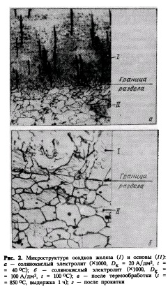 Электроосаждение железа ведется из кислых электролитов с применением нерастворимых анодов при современных скоростных параметрах (DK = 50-5-400 А/дм2, Тэ= 90*100 °С). Металлографические исследования поперечных сечений образцов, полученных по предлагаемой технологии (DK = 20 А/дм2, Т3 = 80—90 °С), показали, что осадок железа, нанесенный из сернокислого электролита, имеет четко выраженную столбчатую структуру. Резко обозначена линия раздела металла покрытия Мп и металла основы М0. Осадок железа, полученный из сульфатно-хлоридного электролита, имеет менее выраженную столбчатую структуру, чем из сернокислого электролита, а линия раздела Мп и MQ не так резко обозначена.