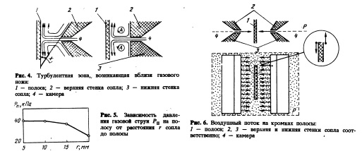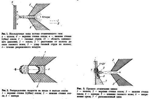 Распределение скорости на входе и выходе из сопла между двумя параллельными губками показано на рис. 2. Зона 2 на рис. 1, имеющая форму стержня, является зоной почти постоянного давления. Ее размеры являются функцией величины зазора сопла и давления газа в камере. Вне этой зоны давление газа снижается. Процесс сжатия расплавленного цинка происходит в зонах 3 и 4, показанных на рис. Моделирование обеспечивает оценку относительной важности ножевого эффекта и напряжений среза как функции состояния газового потока. Различные величины давления в камере и расстояния от щели сопла до полосы в сумме могут давать одинаковые давления на полосу, но создавать при этом различные напряжения, т.е. изменят окончательную толщину покрытия. Эта обширная исследовательская работа была проведена с целью лучшего понимания, как влияют различные параметры настройки и размеры системы отжимающих газовых ножей на остаточную толщину цинкового покрытия. Были рассмотрены' следующие параметры: соотношение давления удара и напряжений среза; распределение давления на полосу при ударе газовой струи; распределение скорости газового потока, порождающего турбулентные потоки, которые могут приводить к разбрызгиванию цинка. В участке А (рис. 4) показана турбулентная зона, ухудшающая распределение * цинка. Эту иллюстрацию необходимо сравнить с результатами предыдущих исследований (см. рис. 4, левая схема), * где разбрызгивание