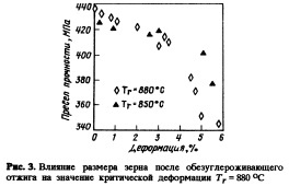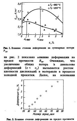 ВЛИЯНИЕ ДЕФОРМАЦИИ ПОСЛЕ ОБЕЗУГЛЕРОЖИВАЮЩЕГО ОТЖИГА НА МАГНИТНЫЕ СВОЙСТВА ИЗОТРОПНЫХ ЭЛЕКТРОТЕХНИЧЕСКИХ ЛИСТОВЫХ СТАЛЕЙАнализируются возможности улучшения магнитных свойств неориентированных кремнистых сталей путем воздействия на размер зерна. Исследована возможность увеличения исходного размера зерна (т.г. размера зерна после обезуглероживающего отжига) путем холодной деформации и последующего отжига после обезуглероживающего отжига (DA).Основным материалом для изготовления магнитных контуров электрических роторов являются магнитнометкие материалы на основе FeSi. Эти изотропные электротехнические листы обычно имеют слабую текстуру, а их свойства во всех направлениях приблизительно равны. Технические требования электротехнической промышленности применительно к листу из динамной стали весьма просты: минимум удельных потерь и максимум проницаемости (индукции). Существенным фактором, влияющим на удельные потери динамной стали, является размер зерна. Влияние его на гистерезис и вихревые токи различно. Величина гистерезиса уменьшается, а вихревые токи возрастают с ростом размера зерна, в результате чего для данного содержания кремния существует оптимальный размер зерна. Примеси в материале затормаживают рост зерна, и поэтому они увеличивают гистерезисную компоненту потерь, благодаря замедлению движения доменов при перемагничивании. Методика эксперимента Непрерывнолитые слябы толщиной 170 мм имели следующий химический состав, % (по массе): С 0,03, Мп 0,30, Si 1,55, Р 0,055, S 0,008, А1 0,18, N 0,009. Они были прокатаны после нагрева в толкательных печах вгорячую до толщины полосы 1,8 мм. После травления была проведена их холодная прокатка с суммарным обжатием 72 % до конечной толщины 0,5 мм. После холодной прокатки образцы были обезуглерожены в непрерывной пе Чи в атмосфере 65 % N2 + 35 % Н2 с точкой росы +40 °С при температуре 850 °С. Время обезуглероживания составляло 4 мин. После обезуглероживания содержание углерода составляло 0,005—0,006 %. После обезуглероживающего отжига образцы стали подвергали различной обработке: холодной деформации от 0, 5 до 6 % с последующим отжигом в нейтральной атмосфере при температуре 850 или 880 °С в зависимости от уровня деформации. После обработки образцов проводили измерение удельных общих потерь при магнитной индукции 1,0 Т и частоте 50 Гц. Размер зерна определяли обычным методом в направлении, перпендикулярном направлению прокатки. Субструктуру экспериментальных образцов изучали методами углеродных реплик и фольг на просвечивающем электронном микроскопе при ускоряющем напряжении 120 кВ. Полученные результаты На рис. 1 показано влияние степени деформации на общие потери Р1Л для двух различных температур отжига Тг. Аналогично зависимости рис. 2