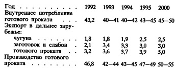 Увеличение экспорта готового проката потребует реализации мероприятий, повышающих конкурентоспособность продукции как с точки зрения снижения издержек производства, так и улучшения качества металлопродукции с организацией в отрасли системы сертификации продукции и систем управления качеством. В противном случае придется отказаться от плана интеграции в мировую экономику в качестве равноправного партнера и согласиться на роль сырьевого придатка развитых стран и банкротства большинства предприятий черной металлургии России. Нами выбран первый путь, так как даже в настоящей кризисной ситуации черная металлургия России обладает достаточным потенциалом для саморазвития. Экспортный потенциал российского металла определяется его качеством, ценой, наличием свободных мощностей по его производству. По качественным показателям российский металл не уступает зарубежным фирмам передовых западных стран за исключением отдельных параметров (разброс химического состава стали, точность листового проката, прочность сортовой стали). По ценам российский металл пока является наиболее дешевым. ' В 1992 г. общая сумма экспорта черных металлов и изделий из них составили 2174 млн.долларов, а за 6 месяцев 1993 г. — 1335 млн.долларов. Экспорт продукции предприятий черной металлургии из России имеет ярко выраженный сырьевой характер. Доля конечных видов продукции (труб, метизов, холоднокатаного листа и т.п.) в российском экспорте составляет 33,9%. Основной поток экспортного металла в настоящее время направляется в наиболее динамично развивающиеся страны ЮгоВосточной Азии (Китай, Таиланд, Тайвань, Республику Корея и др.), доля которых составила в 1992 г. 40%. Доля экспортных поставок из России в страны бывшего СЭВ составила 12,7 %, при этом доля поставок железорудного сырья составляет около половины всего экспорта в эти страны. Экспорт в промышленно развитые страны Западной Европы составляет 25 % и приходится в основном на поставки российского металла (горячекатаного листа и ферросплавов) в Германию (13,3 %), Швейцарию (2,5%), Бельгию (2,0%) и Великобританию (1,7%). Суммарная доля экспортных поставок на рынки Африки, Северной и Южной Америки, Австралии не превышает 2,5 %. Импорт продукции черной металлургии в Россию за 1992 г. оценивается в 880 млн.долларов и представлен в основном продукцией повышенной технологической готовности (например, трубы составляют 43%). Снижение инвестиционной активности в экономике России вызвал спад в потреблении металлопродукции на внутреннем рынке. В 1992 г. потребление готового проката снизилось по сравнению с уровнем 1991 г. на 8 млн.т (15,5%), труб стальных на 2.6 млн.т (28%). Невостребованными оказались транспортный металл, рельсы (до 30%), подшипниковая сталь (до 40 %), канаты (до 20%) и т.д. Это привело к снижению загрузки основных производств отрасли с компенсацией его увеличением производства полуфабрикатов, реализуемых на экспорт. К середине 1993 г. производство черных металлов стабилизировалось, но введение свободных цен на уголь и соответствующее повышение цен на энергоносители и транспорт привели к повышению цен и снижению спроса на металлопродукцию и соответствующему уменьшению выпуска чугуна, стали и проката. По основным видам продукции падение за 8 месяцев 1993 г. составило: по чугуну 9.6 % к соответствующему периоду прошлого года, стали 9,4%, готово