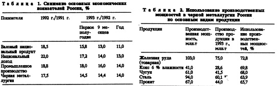 ЭКОНОМИЧЕСКОЕ ПОЛОЖЕНИЕ ЧЕРНОЙ МЕТАЛЛУРГИИ РОССИИ в 1993-94 гг. И ПРОБЛЕМЫ ВХОЖДЕНИЯ В РЫНОЧНУЮ ЭКОНОМИКУАВ 1993 г. продолжалось падение валового национального продукта (ВНП) России, хотя и меньшими темпами (табл. 1). В черной металлургии в 1993 г. снизились темпы спада производства по основным видам продукции и составили: чугун — 9,3 %; сталь 8,8 %; прокат 5,3 %; трубы 20,3%; кокс 4,6%; железорудная продукция 7,2%. Главными причинами спада производства являются разбалансированность поставок сырья и материалов стран СНГ, сокращение. сбыта продукции вследствие неплатежеспособности потребителей и конверсии предприятий оборонного комплекса. Некоторое снижение темпов спада производства черных металлов в 1993 г. обусловлено увеличением их экспорта примерно на 30—40%. При этом в структуре экспорта возросла доля готовой продукции и уменьшилась доля полуфабрикатов (чугуна, слитков, заготовки, слябов). Ниже приведена структура экспорта металлопродукции России, % (числитель 1992 г., знаменатель 1993 г.):