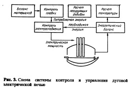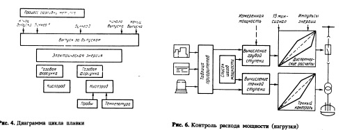 Рис. 3. Схема системы контроля и управления дуговой электрической печыо по моделям сокращают число таких прерываний и обеспечивают экономию времени и энергии. Критерий температуры для выпуска жидкого металла базируется на заданном качестве стали, фактическом состоянии ванны и(или) данных от установки непрерывной разливки. Готовность выпуска жидкого металла рассчитывается с учетом количества легирующих добавок. Качество скрапа и ЖПВ контролируется автоматикой путем сравнения результатов анализа и расчетными величинами, полученными по моделям из принятых значений качества скрапа. Отклонения от этих показателей сообщаются обслуживающему персоналу с рекомендацией предпринять соответствующие операции коррекции. Расход ЖПВокатышей учитывается с целью регистрации отклонений от необходимых значений содержания металла. Функции автоматизаци ЖПВ подразделяются на организационные, энергетические, металлургические и функции контроля оборудования. Организационные функции не связаны напрямую с процессом, но они необходимы в качестве вспомогательных для оебспечения прохождения технологических функций. План производства содержит начальные данные для одной или нескольких плавок, которые выполняются вслед за текущей плавкой. Инструкция по загрузке скрапа формируется на базе плана прозводства и заранее пересылается в место хранения скрапа с целью своевременной подачи тележек. Фактические данные о загруженных тележкаха накапливаются в процессе отслеживания за скрапом и имеются в распоряжении при его подаче. Отслеживание за плавкой обеспечивает сбор всех важных данных во время формирования одной партии плавки и делает их доступными для других участвующих в процессе агрегатов, для отчетов и информации по принятию управляющих решений. Система принятия управляющих решений принимает результаты анализа из лаборатории, запоминает и передает их в соответствующую систему (электропечь, внепечную установку, установку непрерывной разливки).? Энергетический баланс учитывает все составляющие энергии, влияющие на эффективность плавления и температуру расплавленной стали: электрическая, химическая за счет вдувания кислорода и энергия горелок, потери энергии как измеряемые (от охлаждающей воды), так и неизмеряемые (например, излучение, которое считается зависящим от времени включения). Фактический энергоресурс печи рассчитывается на базе баланса по отдельным потокам энергий, которые поступают в электропечь или теряются. Температура ванны с жидким металлом непрерывно рассчитывается по модели на базе энергетического баланса. Расчет начинается с жидкой фазы, если скрап уже расплавлен. Текущее расчетное значение заменяется и устанавливается на измеренную величину температуры. Управ ление подводом энергии — это главным образом управление электрической энергией в печи, что обеспечивает желаемое состояние плавки в кратчайшее время и при минимальной энергии. Управление плавкой происходит посредством инструкций в цикле работы. Существуют несколько диаграмм цикла работы, например для различных марок стали и различных сортов материалов. На рис. 4 приведен пример диаграммы цикла работы, содержащей данные о подведении энергии, о горелках, установке электродов и о других управляющих воздействиях в отдельных фрагментах пр