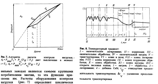 При обессеривании (рис. 5) вычисляется количество обессеривающих добавок, которые должны примешиваться при выпуске жидкого металла в ковш, а затем при промывке чаши содержание серы доводится до необходимого фактического значения. Оборудование контроля нагрузки обеспечивает оптимальное использование составляющих энергии путем управления действиями потребителей (рис. 6). Оборудование контроля нагрузки не связано напрямую с печью. Тем не менее поскольку электропечи на сталеплавильных заводах являются самыми крупными потребителями энегии, то эта функция присвоена им. Расчеты оборудования контроля нагрузки (рис. 7) определяют циклически время tx. Оно устаналивает момент времени отключения потребителя с наименьшим приоритетом. При малом потреблении рассчитывается время t2 до необходимого момента подключения имеющейся энергии. Расчет отключения времени tx учитывает фактическую полную мощность и фактическую потребность в мощности потребителя с низким приоритетом. Фактическая полная мощность рассчитывается через ожидаемое увеличение мощности (f* )• Мощность после отключения потребителя с низшим приоритетом обозначается Р^. Результатом расчета является ожидаемый момент отключения Tv Обычно фактический момент отключения сдвигается назад, поскольку фактическая полная мощность меньше, чем Р max В таком случае расчет момента подключения учитывает (соответственно расчету отключения) минимально ожидаемую мощность Р . и ПИП Р (которая впоследствии представляет ожидаемую мощность) после подключения потребителя с наивысшим приоритетом.