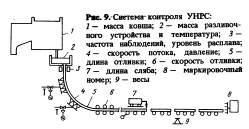 5. Вторичная металлургия Рассмотрены функции управления внепечной установкой для электропечи. Главными задачами являются перспективный расчет и задание температуры. Такой расчет учитывает момент начала обработки, температуру, продолжительность транспортировки и время ожидания (рис. 8). Контроль за обработкой учитывает минимальную ее продолжительность. Целевой анализ в рамках модели по причинам, объясняемым особенностями металлургии, может быть реализован через два промежуточных анализа для выбора легирующих с ориентацией на минимум затрат. При автоматизации следует учитывать подверженные изменениям условия, а именно, свойства материалов или изменения ситуации на установке непрерывной разливки. Это сокращает расход энергиии и материалов и оптимизирует пропускную способность. 6. Установка непрерывной разливки стали Цели автоматизации производственного процесса УНРС включают сокращение времени разливки; наличие детальной информации для выполнения процесса; контроль за охлаждающей водой, пневмосистемой и блокировками; проверку пусковых данных для автоматического режима работы с целью своевременного распознавания нарушения условий и их причин; повышение коэффициента полезного использования. Функции системы автоматизации должны решать следующие задачи управления процессами: подготовку к разливке, сбор фактических данных, оптимизацию процесса, отслеживание за движением материалов, контроль качества (рис. 9). Процессы подготовки к разливке включают испытание в холодном состоянии; проверку в процессе разливки, условия и блокировки подготовки к разливке. Фактическое значение всех измеренных величин и сигналов откладываются в памяти ЭВМ в качестве фактического отоброжения процесса. Данные необходимы для информирования оператора в режиме диалога о текущей ситуации, а частично также в качестве входных данных для оптимизации процесса.