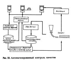 Отслеживание за слитком учитывает такие события, как начало (конец) литья, переходк плавке и окончание разливки. Слиток разделяется на мерные отрезки. Каждый отрезок отслеживается в машине. В результате измеренные значения и события присваиваются отрезком, на которые эти измерения величины и события оказывали воздействия. Отслеживание за уже нарезанными слябами происходит по меньшей мере до маркировочной машины с целью нанесения правильного номера. При запросе на выдачу показателей маркировки формируется правильная информация с учетом зоны перехода плавки, места резки, числа уже нарезанных слябов и номера прутка. Автоматизированный контроль качества (рис. 10) является важным инструментом для персонала, обслуживающего установку непрерывной разливки. Однако реализованный в системе ведения процесса контроль качества не может полностью заменить проверку слябов, блюмов и, заготовок в горячем или холодном состоянии. Одновременная оценка качества поерхности, качества внутренней структуры и степени чистоты позволяют судить о дальнейшей обработке, например, об использовании нагрева, инспектировании, огневой зачистке, градации на классы по качеству и отходам. Создаются возможности для оптимизации, для проведения изменений и оптимизации схемы раскроя, а по результатам распознавания видов ошибок осуществлять обратную связь по параметрам оборудования и устранять возникающие нарушения. Функции контроля качества могут быть подразделены на три области: сбор данных для обеспечения контроля за качеством, определение недостатков в качестве и распознавание возможных недостатков в качестве. Задача функции "сбор данных для обеспечения контроля за качеством" состоит в регистрации измеренных значений и результатов в отношении порезки слитков. Имеющаяся информация необходима для оценки качества. События, сбор которых невозможен в автоматическом режиме, должны своевременно вводиться в режиме обслуживания. Цель функции "определение недостатков в качестве" состоит в определении по зарегистрированным измеренным значениям и событиям возможных качественных недостатков. Оценки проводятся при переходе за предельные значения измеренных значений и событий. Задача функции "распознавание возможных недостатков в качестве" заключается в оценке зарегистрированных измеренных значений и событий. Суждение о возможном недостатке в качестве получается путем сравнения значений с допустимыми границами для данных вероятностей. При наличии нарушения предельного значения предполагается, что качественный недостаток скрывается в части слитка. Долговременные оценки всех относящихся к качеству данных являются базой для надежного статистического прогноза. Точная установка модели качества является долговременной задачей. Дополнительно к знаниям экспертов в области металлургии процесса и к присущим оборудованию воздействиям на качество, точно также важно записывать в систему данные последующей обработки и проверки. 7. Система управления щхшзводством Как уже упоминалось ранее, система управления производством представляет верхний уровень 3 в иерархии автоматизации. При специальной организации и соответствующем потоке данных оборудования использование стандартизированных решений затруднено. Поэтому тем важнее использовать стан