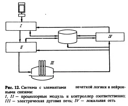 На рис. 11 представлена типичная конфигурация системы автоматизации сталеплавильного завода с двумя электропечами и одной внепечной установкой. Обмен сообщениями осуществляется через шину SINEC—Н1. Станции обслуживания, подключенные к шине, соединены со всеми компьютерами с поверхностью обслуживания XWindows. Реализованное программное обеспечение пользователя базируется на стандартных пакетах с операционной системой UNIX, Data Views для визуализации и ORACLE в качестве банка данных. 9. Нечеткая логика и нейтронные сети В отношении систем и инструминтов автоматизации фирма Сименс хотела бы также обратить внимание на применение новейшей технологии при проектировании и конструировании, а именно на нечеткую логику и нейронные сети (рис. 12). В настоящее время эти технологии дают возможность довольно просто проводить автоматизацию нелинейных и комплексных ситуаций, которые обычно трудно реализуемы математическим путем. Комбинация обоих методов обеспечивает гибкость для будущих применений. Фирма Сименс разработала не только системы управления на базе нечеткой логики и нейронных сетей, но и нашла применение этим методам в различных технических областях. Например, для SIMATICS5 поставляется стандартный модуль реализации систем управления на базе нечеткой логики, поностью оснащенной соответствующим инструментарием. Опробованы на практике разработки в этой области для металлургической промышленности: модель прокатки для широкополосовых прокатных станов; регулировка натяжения, толщины и ровности. Нейронные сети находят применение также для определения неизмеряе мых величин и параметров процессов специально при производстве стали и непрерывной разливке. Полученные результаты оказывают помощь в совершенствовании обычных систем управления, а в экспертных системах с искусственным интеллектом помощь обслуживающему персоналу.