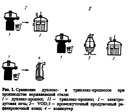 Преимущества дуплекспроцесса (1—4, см. рис. 1): малая продолжительность обработки, широкая возможность регулировать соотношение железосодержащие сплавы/скрап. Недостатки: большое потребление Аг, большое потребление FeSi, низкая стойкость футеровки конвертера. В результате этого производство нержавеющих сталей разных классов стадо дешевле, а сами стали приобрели ряд новых свойств [1]. Точно так же, как и методы вторичной металлургии открыли новые возможности для точного управления качеством производимой стали, использование автоматизации процесса производства стало объективной необходимостью. Различия в технологии обработки и требования к оборудованию определили круг проблем, решение которых может быть осуществлено только с помощью современных систем управления технологическим процессом. Компьютер осуществляет следующие важные функции: гарантированное получение заданного низкого остаточного содержания углерода; оптимальное потребление кислорода и инертного газа в промежуточном ковше и ва кууматоре ВОД; минимизация окисления хрома; выбор инертного газа (возможен азот); минимизация потребления кремния на раскисление; комбинированное раскисление и десульфурация; точный расчет затрат, позволяющий оптимизировать цену продукции за счет выбора легирующих элементов; точное управление температурным режимом для сохранения стойкости футеровки и при выпуске стали; уменьшение интервала между выпусками стали. Оптимальная система управления и автоматизации технологии триплекспроцесса были разработаны фирмой "Mannesmann Demag HiittentechnikN для нержавеющей стали. Эта система включает в себя три основных уровня: измерения, управление технологическим процессом и планирование производства. Главные функции, а именно контролирование и управление процессом, равно как и технологический план, базируются на измеряемых переменных технологического процесса, которые анализируются динамической и статической моделями. Металлургические аспекты Металлургические приемы и их ограничения для различных технологических линий производства малоуглеродистой аустенитной и специальной ферритной нержавеющей стали в основном определены условиями термодинамического равновесия реакции обезуглероживания. Окисление высокохромистой стали при выплавке преследует цель предельно снизить содержание углерода и при этом минимизировать количество хромистого шлака. Окисление углерода и хрома, которое происходит по реакциям, описываемым уравнениями (2)—(3),