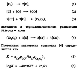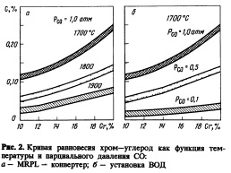 На рис. 2 показаны изменения положения кривой равновесия хром — углерод в зависимости от температуры и парциального давления окиси углерода. Можно видеть, что при содержании хрома порядка 18 % минимально достижимое содержание углерода возможно только при очень высоких температурах или низких парциальных давлениях окиси углерода. Очень высокая температура нагрева на практике не приемлема по экономическим соображениям, так как вызывает ускоренный износ футеровки. Обычно температура при выплавке специальных сталей находится на уровне 1720 °С. При такой температуре и при содержании хрома 18% уменьшить содержание углерода без снижения парциального давления возможно только до —0,2 % и не ниже. Бели требуется более низкое содержание углерода, то следует снижать парциальное давление окиси углерода.