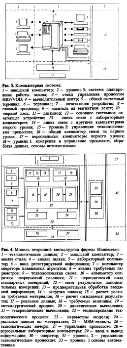 Для снижения парциального давления существуют два основных способа: снижение общего давления над поверхностью металла в процессе вакуумной обработки; снижение концентрации оксида углерода продувкой инертным газом. Резкое снижение давления надежно гарантирует минимальный уровень содержания углерода при ВОДпроцессе. Отрегулировав режим работы в соответствии с кинетикой реакции обезуглероживания, можно обеспечить минимальное образование хромового шлака и, соответственно, снизить расход требуемых реагентов. Расход аргона очень мал. Однако из за медленной скорости реакции обезуглероживания в ВОДпроцессе возникают ограничения по исходному содержанию углерода, хотя на первоначальной стадии плавки используются дешевые высокоуглеродистые легирующие элементы. Практически все эти ограничения могут проявляться при глубоком обезуглероживании в конвертере. В аргоннокислородном конвертере негативным фактором такой технологии является требование высокой скорости продувки инертным газом для снижения парциального давления СО, вследствие чего снижается стойкость футеровки в донной части, поскольку интенсивная продувка осуществляется снизу через фурму. До достижения критического содержания углерода процесс окисления может осуществляться продувкой кислородом с высокой скоростью без снижения парциального давления СО. Высокая скорость продувки кислородом через кислородную фурму в виде трубки, применяемой в процессе MRP Lконвертер, обеспечивает высокую скорость обезуглероживания и укорачивает продолжительность обработки, даже если на стадии подготовки используются дешевые высокоуглеродистые легирующие в большом количестве. Для улучшения кинетических условий реакции обезуглероживания осуществляется перемешивание продувкой малым количеством инертного газа. Износ футеровки мал, и промежуток между заменами футеровки конвертера удлиняется, поскольку скорость кислородной продувки на стадии обезуглероживания уменьшается и регулируется в соответствии с кинетическими условиями протекания химической реакции. Это минимизирует количество образующегося хромового шлака, а также снижает потребность в других реагентах. Последующая обработка в конвертере заключается в глубоком обезуглероживании и дегазации данной плавки и при низких затратах на установку ВОД. Вследствие исходно низкой концентрации углерода продолжительность одного цикла работы установки ВОД составляет примерно 60 мин, что укладывается в условия работы установки непрерывной разливки, которая также может быть использована. Компьютерная система В структуре компьютерной системы имеется три основных уровня: первый — измерение, управление и обработка данных; второй— управление технологическим процессом; третий — процесс планирования производства (рис. 3). На уровне измерений и управления применяются программируемые логические системы управления системой. Этот уровень соединен с более высоким уровнем 2 посредством интерфейсов и общего компьютера связи. Для взаимодействия с операторами установки система управления технологическим процессом предоставляет: набор диалоговых экранов для изменения технологических параметров; в графической форме обобщенные данные с уровня 1, ожидаемые параметры, динамику изменения основных значений выбирае