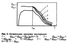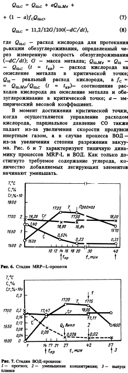 Учитывается также степень безопасности оборудования для оценки расхода газа. По данным динамического мониторинга процесса оказалось, что уменьшение скорости обезуглероживания происходит не ступенчато, а непрерывно, вызывая потребность непрерывного уменьшения подачи кислорода. При протекании реакции обезуглероживания наблюдаются две стадии: начальная стадия без изменения и вторая — после достижения критической концентрации углерода. Поскольку первая стадия характеризуется высокой скоростью обезуглероживания, обеспеченной в основном особыми условиями продувки, то некоторое замедление реакции вызвано фактическим уменьшением содержания углерода в плавке и удлинением времени его поступления в точку реакции. На первой стадии продувки практически только кислород вдувается в максимальном количестве. Вторая стадия продувки начинается с определения критической концентрации углерода. В зависимости от этого уменьшается количество вдуваемого кислорода. Желательный расход кислорода определяется из скоростей обезуглероживания и окисления хрома (рис. 5).
