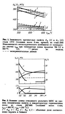 МАТЕМАТИЧЕСКАЯ МОДЕЛЬ СТРУКТУРООБРАЗОВАНИЯ И ПРОГНОЗИРОВАНИЯ МЕХАНИЧЕСКИХ СВОЙСТВ В ПРОЦЕССАХ ГОРЯЧЕЙ ПРОКАТКИ ЛИСТОВОЙ СТАЛИМодель в форме программы для персонального компьютера IBM ХТ/АТ описывает взаимосвязь процессов формирования микроструктуры с условиями термомеханической обработки металла при его прокатке, охлаждении на промышленном широкополосном стане горячей прокатки и в рулоне. Приведены основные составные части алгоритма, описывающие изменение микроструктуры. Программа позволяет прогнозировать механические свойства по всей длине горячекатаной полосы на основе рассчитанных микроструктурных параметров. Прогноз включает в себя расчет пределов прочности, текучести, удлинения и ударной вязкости. Модель может быть использована для оптимизации процессов производства горячекатаной стали с заданными механическими свойствами, контроля качестваПриведем основные составные части алгоритма, описывающие изменение микроструктуры при прохождении металлом технологической линии стана: кинетика рекристаллизации при многократной деформации в аустенитной и аустенитно ферритной областях [1] совместно с расчетом среднего диаметра аустенитного и фер ритного зерна; кинетика распада аустенита на феррит, перлит и бейнит с учетом степени рекристаллизации аустенита [2]; конечный размер фер ритного зерна, объемная доля углеродсодержащих фаз, распределение межпластинчатого расстояния в перлите. Расчет кинетики распада аустенита основан на изотермических диаграммах, которые для углеродистых сталей (<0,6% С; 0,3—2,1 % Мп; 0,11,4% Si; 0 1,6% Ni; 0—0,6% Сг) преедставлены в аналитическом виде, а для эвтектоидных и дис персионнотвердеющих сталей [У8У10 с 0,751,1% С; 09Г2ФБ и 08Г2МФБ (с0,1 % С, 2% Мп, 0,03% Nb, 0,03% V, 0,03% Мо)] в виде базы данных; степень сфероидизации перлита; коалес ценция карбонитридных частиц при охлаждении в рулоне в сталях, легированных ниобием и ванадием; механические свойства готовой горячекатаной стали [пределы прочности и текучести — по уравнениям Пикеринга [3], относительное удлинение и ударная вязкость — по собственным уравнениям (типа Пикеринга)] по всей длине горячекатаной полосы. Точность модели была проверена по данным промышленной прокатки углеродистых и низколегированных сталей с толщиной полос 2 14 мм на широкополосовых станах горячей прокатки 2000 в г.Липецке (Россия) и 1700 в г.Караганде (Казахстан). проектирования оборудования. Сопоставление спрогнозированных и фактических механических свойств углеродмарган цовистой (17ГС с0,17 % С, 1% Мп, 0,5% Si) стали после горячей (температура конца