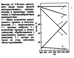 Ориентировочная оценка размера выгод, которые можно получить при условии ввода новых электротермических средств в указанных производствах — 5% в год (объем обрабатываемого металла от общего объема) и допущении, что 1т проката или металлоизделий подвергается только однократному нагреву при ее переделе, показывает возможность сокращения в ближайшие 10 лет энергозатрат на 16—18 %, потерь металла в 2,5 раза, вредных выбросов в окружающую среду в 2,4 раза (см. рисунок). Успешное решение этой задачи возможно при использовании преимуществ прямого электронагрева в наиболее полной мере, при рациональном применении (технологически и экономически) в зависимости от сортамента обрабатываемой металлопродукции и уровня требуемого его качества (физикомеханических свойств, состояния поверхности, отсутствия кривизны). Поэтому в таблице рекомендуются основные области применения прямого электронагрева. Наиболее целесообразно в первую очередь обновить и расширить применение электротермических средств для нагрева и термообработки на заводах качественной металлургии, на мелкосортных и проволочных прокатных станах; в отделениях для термообработки сорта, труб, а также в термокалибровочных и метизных производствах. Следующий этап — применение таких средств для горячей прокатки крупных заготовок, блюмов, слябов и т.п. в сочетании с пламенным нагревом и без него. В условиях становления в России новых рыночных экономических отношений повышение экономичности технологических процессов в металлургии, повышение качества металлопродукции до уровня мировых требований имеют первостепенное значение. Интенсивное расширение применения непосредственных видов электронагрева в черной металлургии России — выгодное направление для привлечения инвестиций с целью реализации наиболее эффективных инновационных программ и мероприятий. СБОРНИК НАУЧНЫХ ТРУДОВ Черная металлургия России и стран СНГ в XXI веке. Т о м I, Москва 1994 |
