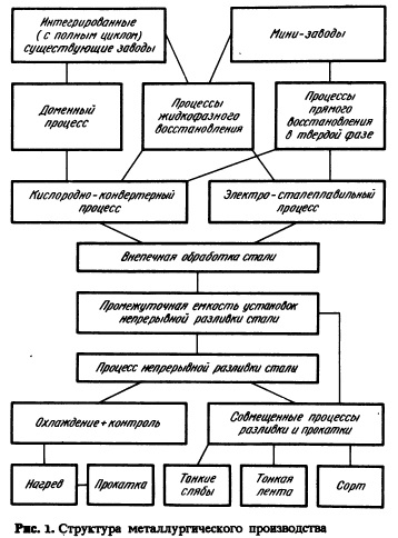 ЧЕРНАЯ МЕТАЛЛУРГИЯ РОССИИ СЕГОДНЯ И ЗАВТРАРассмотрены основные направления развития научноисследовательских работ в области металлургического производства. Конечным результатом исследований должно явиться создание комплексной системы v автоматизированного управления всем циклом металлургических процессов как в рамках интегрированных заводов с полным циклом, так и минизаводов, обеспечивающих широкий сортамент металлопродукции для металлопотребляющих отраслей. Важнейшей задачей черной металлургии является ускоренное обновление и техническое перевооружение отрасли на основе широкого внедрения принципиально новых технологий, обеспечивающих наивысшую производительность труда и эффективность производства, радикальное повышение качества и расширение сортамента черных металлов, надежную охрану окружающей среды и решение социальных вопросов. Ускорение научнотехнического прогресса, совершенствование действующих и разработка принципиально новых процессов должны базироваться на потенциале научных исследований академической, отраслевой, вузовской и заводской науки. Предстоит выполнить комплекс научно исследовательских и опытноконструкторских работ по развитию совмещенных технологических процессов (от переработки руды до производства готового проката). Для создания таких процессов следует решить ряд сложных научнотехнических задач, в том числе обеспечить необходимое качество и заданные параметры продуктов, передаваемых с одного агрегата на другой; требуемые взаимосвязанные скорости процесса в отдельных звеньях агрегата и совместимых агретатов; новый высокий уровень автоматизации и конт рольноприборного оформления. Необходимо оценить объем и структуру выплавки чугуна и стали, что позволит выявить основные направления развития сталеплавильного производства на ближайшие десятилетия и сориентировать металлургов как в промышленном, так и в научном плане совершенствования процесса производства стали. Основываясь на достижениях фундаментальной и прикладных наук, а также техники металлургического производства, уместно поставить вопрос о будущей структуре металлургического производства, эффективности использования различных агрегатов. рии металлургических предприятии: интегрированные заводы мощностью до нескольких миллионов тонн готовой продукции, как правило, листовой, но иногда и высококачественной сортовой, включающие доменные печи, конвертеры и последующее оборудование и работающие в цикле руда—прокат; минизаводы производительностью 1,0—1,5 млн.т/г., ориентированные на производство листового, сортового и профильного проката, работающие в цикле скрап—прокат. Схема производства металлопродукции по этим двум категориям показана на рис.1.