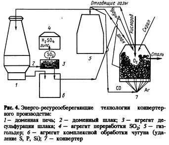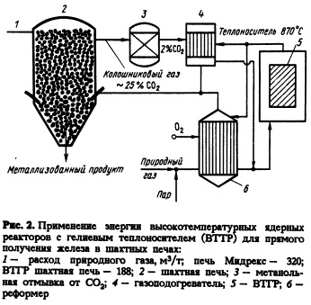 Безусловно, крупные интегрированные заводы сохранят свою ведущую роль по крайней мере в первые 20 лет XXI в., но интенсивное развитие в этот период получат все же минизаводы. В связи с этим направления развития научных исследований целесообразно оценивать применительно к каждой стадии металлургического производства, характерной для интегрированных и минизаводов. По данным работы [1], после спада производства чугуна в России и других странах с бывшей плановой экономикой с 1995 г. продолжится рост его производства с темпами прироста 2,02,5 % в год. Одновременно предполагается снижение потребления коксующихся углей в этих странах на 20% вследствие увеличения количества сырого угля, вдуваемого в доменные печи. Основной науч нотехнической проблемой явится увеличение количества вдуваемой угольной пыли до 100 кг/т чугуна к 2000 г. с последующим решением проблемы увеличения этих показателей до 220 кг/т с обогащением дутья кислородом. Развитие технологии восстановительной плавки чугуна в мире, очевидно, пойдет по пути дальнейшего развития уже наиболее опробованных в промышленных масштабах процессов КОРЕКС и ПЖВ (Россия), имеющих, кроме того, сравнимые с доменной технологией расходы первичного топлива на тонну чугуна 5,05,4 ГДж. Тем более, что особенно последний процесс имеет значительные резервы по увеличению его экономичности. Для развития процессов восстановительной плавки чугуна предстоит решение научнотехнических задач их адаптации в современную структуру производства — это прежде всего увеличение единичной мощности агрегата > 1,0—2,0 млн.т, удлинения кампании печей до 4—5 лет. Однако, несмотря на успешное развитие технологий восстановительной плавки, они не окажут существенного влияния на производство чугуна в ближайшие 20 лет [2]. Применительно к минизаводам развитие получат процессы производства губчатого железа в шахтных печах (установки Мидрекс, ХИЛ). Наиболее перспективными направлениями развития технологии металлизации в шахтных печах, требующих научных проработок, являются: увеличение единичной мощности лечи до 0, 71 млн.т; перенос конверсии природного газа в рабочее пространство печи вплоть до полного вывода реформера из газовой схемы; использование в газовой схеме дуговых плазмотронов для нагрева газа, установок деструкции сверхзвукового потока С02 в неравновесном СВЧразряде, аппаратов мембранного типа и метанольной очистки газов от С02; непосредственное комбинирование агрегатов металлизации с высокотемпературной ядерной энергоустановкой. Последнее позволяет снизить вдвое расход природного газа до 150170 мУт губчатого железа, а коэффициент использования тепла реакторной установки составит 0,79, что существенно выше, чем на АЭС (0,320,36) (рис.2). [3]; получение восстановительных газов путем газификации некоксующихся углей. Однако существующие промышленные агрегаты газификации (Лурги и др.) плохо совмещаются с металлургической частью и приводят к увеличению размера инвестиций на проектную тонну годовой производительности на 70—80 %. Можно констатировать, что эта задача сегодня не имеет отработанного научного и технического решения, но, по нашему мнению, решение этой проблемы необходимо уже в следующие 30—40 лет, в течение которых, вероятно, будут в значительной степени исчерпаны подтвержденные запасы природного газа. С этой то