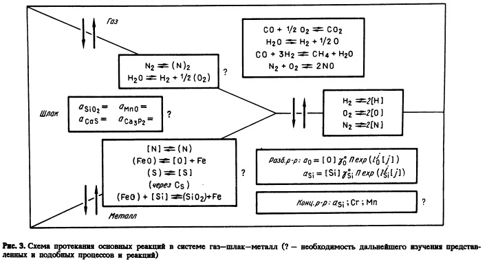 Состояние исследований в области термодинамики шлаков намного хуже, что делает невозможным расчет равновесий в системах металл—шлак—газ с достаточной для большого числа технологий и АСУ ТП точностью. Принятые до недавнего времени термодинамические модели жидких шлаков базируются на весьма ограниченных по точности и объему массивах экспериментальных данных о термодинамических свойствах, которые во многих случаях находятся в явном противоречии со сведениями о равновесии фаз в шлаках [4]. Ранее практически отсутствовала термодинамическая информация о системах, которые наряду с оксидами содержали бы продукты рафинировочных реакций: сульфиды, фосфиды и др. или распространенные компоненты типа флюорита, криолита и др. Существующие интерпретации термодинамических свойств шлаковых расплавов основываются на упрощенных представлениях о шлаках как растворах ионов. Однако эта концепция ни в чистом виде, ни в усовершенствованном, в том числе и с учетом полимеризации молекул кремнезема, не описывает характеристики расплавов, содержащиходновременно различные катионы и анионы, что характерно для реальных металлургических шлаков. На рис.З схематически представлены основные реакции, как изученные, так и требующие дальнейшего изучения в системах газ—металл—шлак. В ЦНИИчермете в последние годы начаты систематические исследования термодинамики шлаков благодаря разработке нового метода определения термодинамических свойств шлаков, основанного на сочетании эффузионной техники Кнудсена с массспектральным анализом газовой фазы. В нем преодолены главные трудности изучения шлаков, обусловленные низкой упругостью пара основных компонентов (СаО; А12Оэ; Si02) и их определенной химической инертностью по отношению к удобным для исследования газовым смесям [5]. Последние достижения открывают возможности построения надежных физикохимических моделей сталеплавильных процессов и процессов внепечной обработки стали: раскисления металла и остатков печного шлака, шлакообразования, состояния шлака, десульфурации, которые должны составить основу систем автоматизированного управления. Использование физикохимических моделей имеет ряд существенных преимуществ перед часто применяемым в АСУ статистическим подходом. Главные состоят в том, что физикохимические модели создают возможность учета различий каждой плавки по химическому составу, активности кислорода, температуре и другим технологическим особенностям. Последнее позволяет изменять режимы обработки на уровне основополагающих химических реакций и контролировать в ходе процесса химические и фазовые составы металла и шлака при раскислении, присадке ферросплавов и шлакообразующих, а также вследствие размыва футеровки. Для построения алгоритмов управления процессами необходимы модели, в которых учитывались бы как термодинамические, так и кинетические аспекты процессов. Однако несмотря на то, что в настоящее время существует общая схема построения кинетических моделей, создать их практически невозможно, поскольку экспериментально определенные кинетические параметры характеризуют только те металлургические агрегаты, для которых они найдены. Методов теоретической оценки параметров, описывающих скорости химических реакций и явления массопереноса, не существует. Н