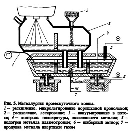 Попрежнему одним из важнейших направлений остается комплексная автоматизация процессов управления как технологией конвертерной плавки, так и производством, основополагающими разработками которой является создание технологических алгоритмов на базе динамических систем контроля параметров процесса. г Нет необходимости подробно останавливаться на определившихся к настоящему времени металлургических возможностях различных способов внепечной обработки стали. Все вышеперечисленные проблемы определения термодинамических и кинетических закономерностей в равной степени относятся и к методам вторичной металлургии. Однако просматривается целесообразность перевести часть технологических операций, характерных для агрегатов внепечной обработки стали, непосредственно к формирующемуся непрерывному слитку. Зарубежные и отечественные исследования последних лет в области непрерывной разливки стали показали принципиальную возможность использования специальной конструкции промежуточной емкости УНРС в качестве самостоятельного металлургического агрегата комплексной обработки металла: рафинирования, микролегирования и модифицирования путем ввода порошковой проволоки или ленты или другими методами с одновременной обработкой металла нейтральным газом, фильтрации расплава, плазменного подогрева металла. Этим обеспечивается непрерывность операций и широкая возможность корректировки химического состава стали и температурного режима процесса разливки, а следовательно, и его стабильность (рис.5). Таким образом, создание агрегата комплексной обработки стали непрерывного действия является актуальным. При этом ожидается сокращение расхода легирующих, модифицирующих и микролегирующих материалов на 25—50%, снижение расхода чугуна на 20 кг/т стали за счет сокращения потерь тепла при транспортировке металла от сталеплавильного агрегата до УНРС и в процессе разливки, значительное уменьшение количества неметаллических включений в непрерывнолитых слитках при одновременном улучшении качества их поверхности и макроструктуры. В технологию внепечной обработки стали в промежуточной емкости удачно вписывается процесс поточного струйного вакуумирования<