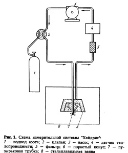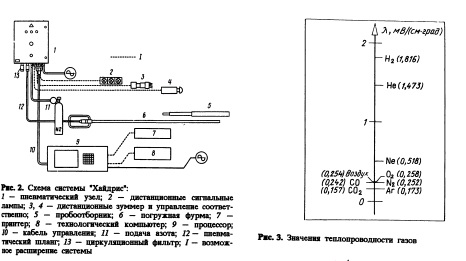 ПОГРУЖНАЯ СИСТЕМА "ХАЙДРИС" ПРЯМОГО ОПРЕДЕЛЕНИЯ СОДЕРЖАНИЯ ВОДОРОДАВ отличие от других погружных пробоотборников и фурм, применяемых для измерения содержания водорода в жидком металле, пробоотборник и фурма системы Хайдрис состоят из газовой трубки вместо электродов.1. Принцип измерения Принцип измерения, на котором основана система "Хайдрис", иллюстрирует рис. 1. На начальной стадии измерения все трассы системы находящуюся внутри пористого жаростойкого керамического колпака. Далее подача азота прекращается, и находящийся в измерительной системе азот рециркулирует с помощью насоса. Растворенный в стали водород проникает в газноситель. При этом устанавливается равновесие между его парциальным давлением в стали и в газовой фазе. Парциальное давление водорода в газе контролируется в потоке детектором на принципе измерения теплопроводимости. Газ рециркулирует через жидкую ванну металла до тех пор, пока не возникает нового равномерного значения содержания водорода. При этом измеряется новое стабильное парциальное давление водорода. Общее время измерения составляет 40—60 с в зависимости от содержания водорода в стали.