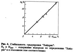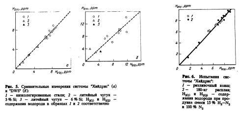 Воспроизводимость результатов "Хайдрис" и "DWS" была подтверждена. Выполнено несколько повторных измерений с перерывом 3— 5 мин. Соответствующие результаты сравнительных измерений системами "Хайдрис" и "DWS" приведены на рис. 5. Результаты испытаний показали воспроизводимость "Хайдрис" в диапазоне 4% ppm Н2. Системе "DWS" соответствуют большие отклонения даже в случае особой тщательности работы в лабораторных условиях.