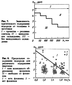 Проводились также измерения "Хайдрис" с N2 и смеси H2+N2 в качестве газаносителя. Целью испытания было доказать, что газ в системе "Хайдрис" достигает равновесия с расплавом. Системой "Идрис" проводилось два измерения. Первое измерение осуществляли с газомносителем, содержащим 15% Н2. Избыточный водород в газеносителе растворялся в расплаве при достижении равновесия. Второе измерение проводили с газомносителем из 100 % N2, в котором водород абсорбировался из жидкой ванны при достижении равновесия. Результаты испытаний приведены на рис. 6. В этих испытаниях определено, что значение содержания водорода, полученное в системе "Идрис" при использовании смеси 15% Н2—N2 в качестве продувочного газа на 0,1—0,5 ррт (выше, чем полученные со смесью из 100% N2. Эту небольшую разницу следовало ожидать из-за кинетики взаимодействия газ—металл на границе с газовой фазой при первоначальной высокой и низкой концентрациях реагирующего вещества. 4. Воздействие водорода на качество сталиВодород является причиной ряда дефектов в стали или ее разрушения. Эти дефекты вызваны внутренним давлением, возникающим при образовании из атомов водорода, имеющих большой объем стабильных молекул Н2. Возможность дефектов увеличивается с ростом содержания водорода и толщины листа (рис. 7). Водород удаляется из стали путем контролируемого медленного ее охлаждения или отдельной изотермической обработкой перед дальнейшими операциями. Однако эти процессы снижают эффективность ввода ряда легирующих добавок и требуют дополнительных затрат. Флокены. Образуются изза вредного воздействия водорода. Они появляются при температуре ниже 200 °С и приводят к разруше 232 нию стальных конструкций. Наиболее вероятно образование флокенов вокруг включений и в зонах мартенсита или зоне сегрегаций. Фло кены не наблюдаются в нелегированных сталях, но легко образуются при легировании марганцем, хромом и никелем. Данные рис. 8