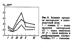 Раковины и подкорковые пузыри образуются в результате избыточного содержания растворенного азота, СО и водорода. Ужесточение требований к качеству стали вызывает необходимость уменьшать количество примесей и раковин. Если распределение водорода в стали неоднородно, это может привести и к неоднородности качества металлопродукции. 5. Источники поступления водорода Предотвратить поступление водорода легче, чем проводить термическую обработку. Система "Хайдрис" является эффективным инструментом для выявления, понятия и исправления основных причин увеличения содержания водорода. Существует ряд источников водорода, общих для выплавки и разливки стали. Одним из источников роста содержания водорода является атмосферная влага. Переход водорода осуществляется посредством прямого контакта во время, выпуска плавки (рис. 9), процессами абсорбции и диффузии через шлак и абсорбцией из гигроскопических добавок. Флюсующие добавки извести, известняка и доломита увеличивают содержание водорода в стали. Известь легко абсорбирует атмосферную влагу и часто является причиной повышенного содержания водорода, особенно если ее хранение не организовано соответствующим образом. Шлак имеет способность удерживать воду. Эта тенденция увеличивается с ростом его основности. Текучесть шлака также имеет большое значение. Жидкоподвижные шлаки легче переносят водород в сталь. Материалы для футеровки печи, ковшей и промежуточных разливочных ковшей могут вносить значительное количество водорода. Для новой футеровки рост содержания достигает до 2 ppm. Содержание водорода возрастает с увеличением добавок ферросплавов. Эта тенденция может быть уменьшена хранением ферросплавов в сухих помещениях. Высокое содержание серы ведет к уменьшению содержания водорода. Поэтому десульфу рированная сталь более чувствительна к росту содержания водорода. Обессеривающие добавки также являются источником влаги.