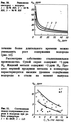 Высокое содержание кислорода предотвращает рост содержания водорода. Посредством изменения технологии плавки с сохранением содержания кислорода на высоком уровне в течение более длительного времени можно уменьшить рост содержания водорода (рис. 10). Рассмотрим собственно сталеплавильное производство. Сухой скрап содержит ~1 ррт Н2. Жидкий металл содержит ~2 ррт Н2. Процесс верхней продувки металла в конвертере характеризуется низким уровнем содержания водорода в стали на момент выпуска (<2ррт). Высокий уровень содержания водорода может быть получен от утечки воды из поврежденной фурмы. Практика донной продувки может привести к увеличению содержания водорода в случае использования в качестве охладителя углеводородов. На рис. 11 приведено сравнение уровней содержания водорода в стали, полученной по этим двум технологиям.
