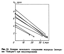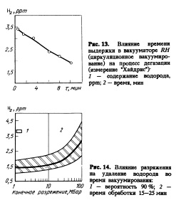 6. Вакуумирование Вакуумирование проводится для снижения до минимума содержания водорода. Для оптимизации процесса вакуумирования необходимо точное измерение содержания водорода в стали до и после вакуумирования. При этом появляется возможность снижать стоимость. Непрерывное измерение содержания водорода после вакуумирования обеспечивает эксплуатационный персонал надежным инструментом контроля качества перед отправкой ковша на непрерывную разливку или в разливочное отделение. Основные параметры: начальный уровень содержания водорода — жидкая сталь с малым содержанием водорода достигает требуемого уровня концентрации быстрее (рис. 12); время вакуумирования — очень важно определить заданное время вакуумирования, его увеличена, рртние приводит к уменьшению содержания водорода (рис. 13); минимальное разрежение — чем ниже давление, тем более эффективно удаление водорода (рис. 14). Низкое давление должно быть достигнуто как можно быстрее, объем продувки инертными газами — увеличение количества продуваемого инертного газа улучшает удаление водорода из стали; » марки — спокойная сталь требует более долгого периода вакуумирования. ![]()