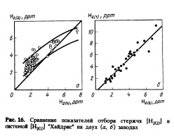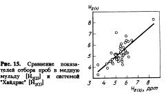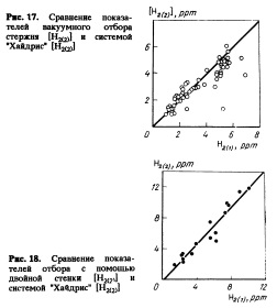 На рис. 16 показаны сравнительные данные при отборе стержне (ферростатическое заполнение). Окончательный результат всегда зависит от используемой техники. В основном значения системы "Хайдрис" в широком диапазоне аналогичны результатам стержневого отбора. В первом случае (см. рис.16,а) есть хорошая корреляция с стержневым методом отбора. Во втором случае (см. рис.16,5), однако, стержневой отбор дает положительное отклонение результатов измерений. Полученные значения содержания водорода при отборе стержня (вакуумное наполнение) находятся в диапазоне значений системы "Хайдрис". Данные рис. 17 иллюстрируют хорошую корреляцию при концентрации ниже 5 ррт. При повышении концентрации выше указанного значения разница отклонений увеличивается. Анализ с помощью пробницы с двойной стенкой (рис. 18) состоит в определении количества водорода, выделившегося из охлаждаемой пробы и количества водорода, оставшегося в затвердевшем образце. Система "Хайдрис" практически всегда дает меньшие значения определяемой концентрации изза улавливания водорода, выходящего из стали в вакуумную камеру.