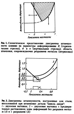 ПОВЫШЕНИЕ ЭФФЕКТИВНОСТИ ОЦЕНКИ ШТАМПУЕМОСТИ ЛИСТОВОЙ СТАЛИ В СТАНДАРТНЫХ ЛАБОРАТОРНЫХ ИСПЫТАНИЯХС целью улучшения оценки штампуемости в аттестащюнных испытаниях листовой стали предлагается система механических показателей, характеризующих свойства металла в условиях проявления как предельных, так и устойчивых пластических деформацийПри аттестации листовой стали доминирует система стандартизованных показателей, выявляемых в испытаниях на растяжение, вытяжку, твердость и дополняемых микроисследованием. Регулируемые при производстве листового проката, но не учитывающие конкретные условия штамповки, эти показатели не объясняют в ряде случаев ее результаты. В связи с этим оправданными представляются попытки использовать в оценке качества листа информацию, получаемую из диаграмм предельных деформаций [1]. Однако прямое использование диаграмм в аттестации промышленных партий стали затруднено изза сложности их построения. Проблемой является также стандартизация самого построения. С целью решения этих вопросов предложены диаграммы штампуемости [2], характеризующие предельно допустимую данным металлом интенсивность деформации. Она связана со значениями показателя, определяющего жесткость ннапряженнодеформированного состояния при листовой штамповке (рис. 1). В этом случае при аттестации качества листовой стали достаточно ограничиться значением интенсивности, которое соответствует ординате минимума диаграммы. Как доказывает анализ работы [2] , вместо этой величины можно использовать значение деформации е в момент разрушения металла при нагружении его по схеме двухосной вытяжки, например, вытяжки сферы в испытании по Эриксену.