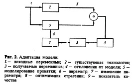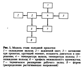 Моделирование работы прокатного стана На рис. 1 показаны основные составляющие прокатного стана. Модель стана холодной прокатки необходима для оптимизации и изменения схемы проходов; расчетов в цепях контроллеров и диагностики прокатного стана. Для достижения наилучшей организации прокатного производства желательно иметь автоматическую, самообучающуюся модель процесса с вводом исходных параметров процесса прокатки. Измеряемые параметры (и возможные погрешности для усилия при прокатке, крутящего момента валка, проскальзывания в валковом промежутке), полученные в процессе работы, сравнивают с результатами моделирования. Получаемые отличия в обоих случаях вводятся снова в модель для ее адаптации, отладки, в результате чего и осуществляется замкнутый цикл до тех пор, пока отклонения не будут минимизированы (рис. 2).