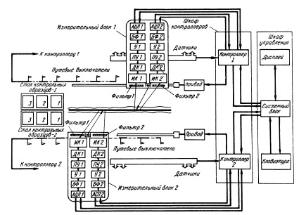 где I — регистрируемый поток излучения; II — поток от линии Fe при X = 0; 12 — поток от покрытия при X = со; 13 — поток обратно рассеянного излучения от Pu238; jLij и \&2 ~ коэффициенты поглощений линий Fe в покрытии и элемента покрытия в покрытии; kl, k2, кЪ — эффективности регистрации прибором соответствующих аналитических линий. Так как коэффициенты поглощения линий Pu238 в покрытии в несколько раз меньше и /12, то зависимость потока обратно рассеянного излучения от толщины покрытия слабая и можно считать третье слагаемое в выражении (1) постоянным. Электролитическое оловянное покрытие имеет толщину, не превышающую 2 мкм, поэтому при его измерении вторым слагаемым в (1) можно пренебречь. При регистрации потока от горячего цинкового покрытия наоборот второе слагаемое является определяющим. Вклад первого слагаемого существенен лишь в начале диапазона измерения при малых толщинах покрытия. Здесь он приводит к уменьшению чувствительности толщиномера. Чтобы ее поднять, используются физические фильтры из А1, которые помещаются перед входными окнами детекторов. Эти фильтры эффективно поглощают линию Fe. В состав каждого толщиномера входят три измерительных блока (по одному на каждую сторону полосы и один — резервный), шкаф с контроллерами (ШК) типа КСИ—16 и пульт управления (ПУ) с ЭВМ типа IBM PC. Схема толщиномера представлена на рисунке. Каждый измерительный блок (БИ) содержит два независимых детектора рентгеновского излучения — ионизационные камеры (ИК), наполненные благородными газами или их смесями. Электрический сигнал с ИК модулируется динамическим конденсатором (ДК), усиливается предусилителем (ПУ) с большим входным сопротивлением, затем усилителем (У) и после синхронного детектирования и фильтрования фильтром Бесселя (БФ) поступает на вход аналогоцифрового преобразователя (АЦП) двойного интегрирования и далее в контроллер. Контроллер управляет работой АЦП, приводом перемещения измерительного блока поперек полосы, опрашивает и анализирует состояние датчиков (скорости полосы, положения измерительного блока, начала и конца рулона и т.п.), пересылает информацию для дальнейшей обработки в ЭВМ пульта управления. Как видно из рисунка, в каждом измерительном блоке имеется два независимых канала регистрации излучения. В одноэлементных толщиномерах сигналы от обоих каналов усредняются в контроллере, уменьшая случайную погрешность измерения. Следует отметить, что в толщиномерах используется прямая схема измерения, обеспечивающая минимальную величину погрешности [1]. Она требует высокой стабильности параметров измерительного тракта, поэтому периодически (1—2 раза в сутки) осуществляется автоматическая коррекция его показаний.