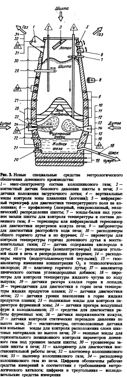 В XXI веке в черной металлургии получат ' распространение апробируемые в настоящее время новые специальные наукоемкие приборы на классических и новых методах измерения. В доменном производстве опробован ряд новых средств метрологического обеспечения (рис.З), включая уровнемеры и профилемеры шихты, термографы и термовизоры, измерительные зонды и балки, устройства контроля давлений по высоте печи, прецизионные газоанализаторы, средства технологической диагностики параметров жидких продуктов плавки непосредственно в горне печи, средства контроля зоны плавления (когезии) материалов в печи, виброметры для диагностики расстройств хода печи и настылей, бесконтактные измерители температур жидкого чугуна и горячих восстановительных газов. Мощные агрегаты оснащают современным весодозирующим оборудованием, тензопреобразователями на монокристаллическом сапфире, встроенными в оборудование термодатчиками, измерителями влажности кокса и граншлака, системами технической диагностики ответственных механизмов и машин, экологическими приборами. Получают распространение перспективные устройства отбора в потоке шихтовых материалов, механизированные станции испытаний доменного сырья, автоматизированные системы с рентгеноспектральными анализаторами.Анало гичные приборы получают распространение в установках бескоксоной металлургии. В сталеплавильном производстве получают распространение измерительные погружные зонды с многоцелевыми датчиками одноразового действия для контроля температуры жидкого металла и содержания углерода, кислорода и других элементов, а также отбора пробы для последующего полного химического анализа металла; газоаналитические системы контроля состава отходящих газов с прецизионными массспектрометрами для динамического управления технологией выплавки стали и внепечной обработки; измерители процесса шлакообразования по шуму и вибрации, границы шлак — металл на микроволновом и электрическом принципах; быстродействующие весо дозаторы для сыпучих и ферросплавов и крановые весы на мессдозах для динамического ведения разливки, взвешивания жидкого металла и скрапа; прецизионные измерители температуры качественных сталей с погрешностью ± 2 °С; лазерные и инфракрасные измерители износа футеровки сталеплавильных агрегатов; интегральные автоматизированные системы аналитического контроля (АСАК) с прецизионными многоэлементными спектрометрами и переносные спектрометры с волоконными световодами для экспрессного анализа хи мического состава материалов и продукции непосредственно у агрегатов; инфракрасные и лазерные измерители уровня жидкого металла в емкостях и кристаллизаторе УНРС; измерители усилий, скорости вытягивания и формирования параметров слитка; датчики контроля профиля жидкой фазы внутри слитка; измерители электрических параметров, режима охлаждения и положения электродов электросталеплавильных агрегатов; параметров инертных газов для вакуумных печей. В прокатном производстве получают распространение измерители в потоке геометрических размеров, формы, поверхности и механических свойств на лазерном, оптическом и инфракрасном методах измерения; приборы комплексного контроля режима прокатки (усилия, темпа, скорости, натяжения и температуры полосы и др.); приборы н