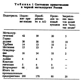 СОВЕРШЕНСТВОВАНИЕ ОРГАНИЗАЦИОННО-ЭКОНОМИЧЕСКИХ ФОРМ УПРАВЛЕНИЯ ПРЕДПРИЯТИЯМИ ОТРАСЛИ И ВОПРОСЫ ПРИВАТИЗАЦИИИзлагаются основные принципы проводимой в России приватизации предприятий черной ме таллургии, дается их критическая оценка и предлагаются пути сохранения управляемости отраслью на основе формирования различных холдинговых структур с участием государственной собственности (финансопромышленные группы, трастовые и другие компании). По возможности приватизации все объекты и предприятия федеральной, государственной территориальной и муниципальной собственности распределены на следующие группы: запрещенные к приватизации, т.е. сохраняемые в государственной собственности; приватизируемые в соответствии с Указами Президента России по решению правительства или Госкомимущества России; приватизируемые на основе местных программ или по решению соответствующих органов государственной власти; подлежащие обязательной приватизации. В качестве основных способов приватизации применяется продажа акций открытых акционерных обществ, продажа предприятий, объектов, а также активов ликвидируемых предприятий на аукционах, коммерческих конкурсах, инвестиционных торгах, выкуп арендованного ранее имущества. Для гарантии права населения на приобретение государственной собственности за приватизационные чеки было организовано проведение специализированных чековых аукционов и установлены нормативы оплаты чеками приватизируемого имущества. Для широкой приватизации методом продажи акций потребовалось осуществить коммерциализацию государственных предприятий с одновременным их преобразованием в акционерные общества открытого типа. Определяющую роль в этом сыграл соответс гвующий Указ Президента Российской Федерации, согласно которому обязательному преобразованию в акционерные общества открытою типа подлежали все предприятия, .находящиеся в федеральной собственности и имеющие численность персонала более 1000 человек или балансовую стоимость основных фондов свыше 50 млн.рублей. Практически все металлургические предприятия, кроме запрещенных к приватизации и обслуживающих производство, подлежали акционированию и приватизации. Акционерное общество с момента его регистрации выходило из структуры управления соответствующего министерства, ведомства и органов отраслевого управления местной администрации. Одновременно с преобразованием в акционерное общество каждым предприятием разрабатывался план приватизации^ включающий порядок и условия приобретения акций как работниками, так и сторонними инвесторами, в том числе иностранными. Законодательство России по приватизации имеет социальную ориентацию. Преимущество в приобретении акций имеют работники данного предприятия, для которых предусмотрено три варианта льгот. Первый вариант включает бесплатное получение привилегированных (неголосующих с гарантированным дивидендом) акций в размере 25 % уставного капитала, покупку до 10 % уставного капитала обыкновенных акций со скидкой 30% и рассрочкой оплаты до трех лет, а также опцион должностным лицам администрации на приобретение по номинальной стоимости обыкновенных акций в размере до 5 %. Кроме того, для работников резервируется дополнительно 10% акций в специальном фонде (ФАРП). Второй вариант льгот закл